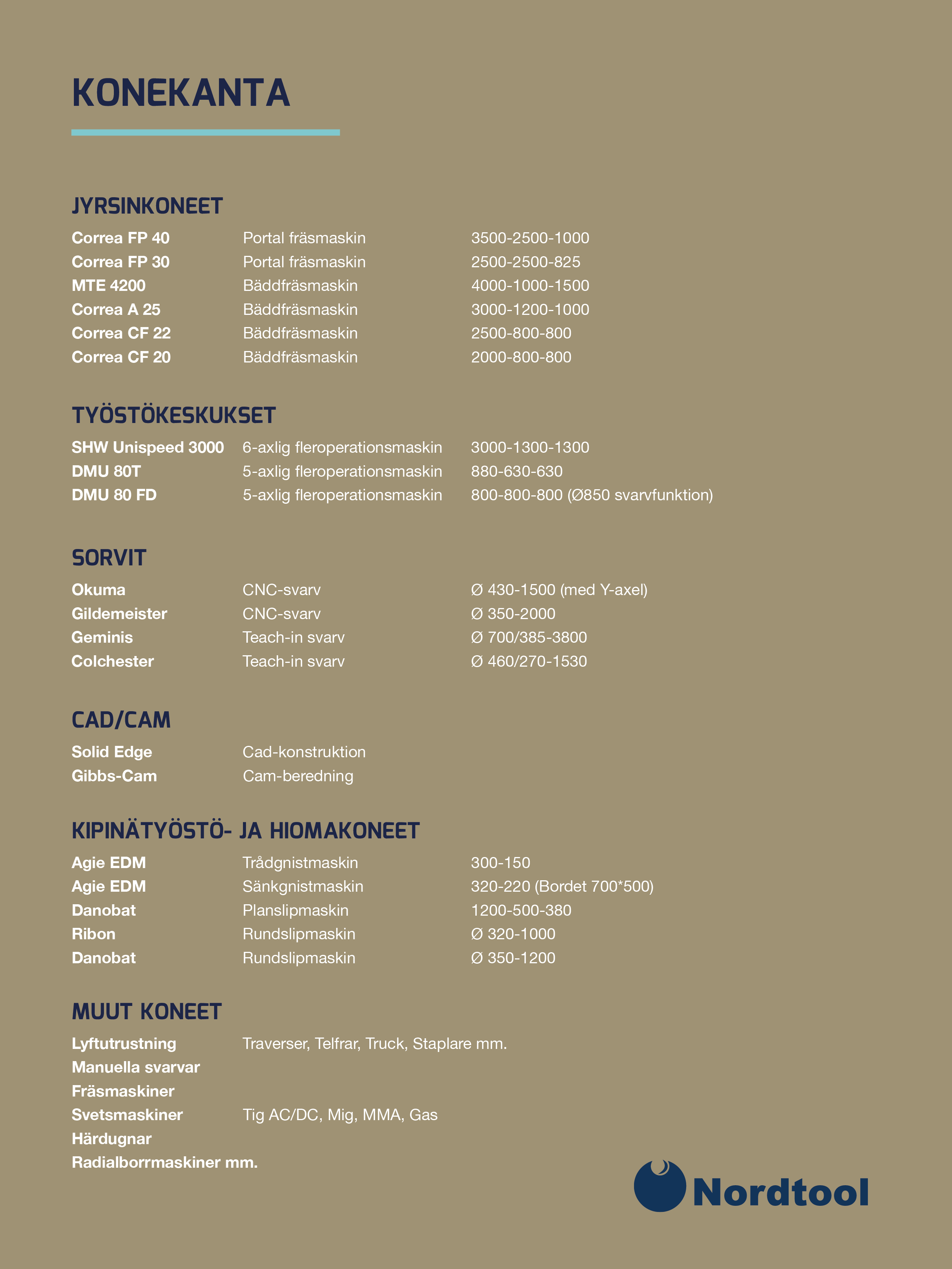 Käyttämiemme CNC-, CAD- ja CAM-teknologioiden avulla pystymme kehittämään ja valmistamaan tuotantotyökaluja mitä erilaisimmissa muodoissa. Olemme panostaneet konekantaamme ja henkilöstömme osaamiseen, jotta voimme toimittaa sinulle sen, mitä haluat ja tarvitset.